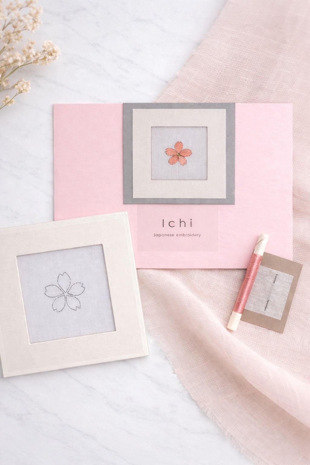 ●写真一枚目 お届けセット 図案つきカクイチベビー一枚・針一本・糸一管・手順書 ●写真二枚目 カクイチベビー一枚 紙枠:10cm×10cm 刺繍面の生地:綿 ●写真三枚目 日本刺繍用機械針一本 オリジナル絹糸 約6.5m巻×一管